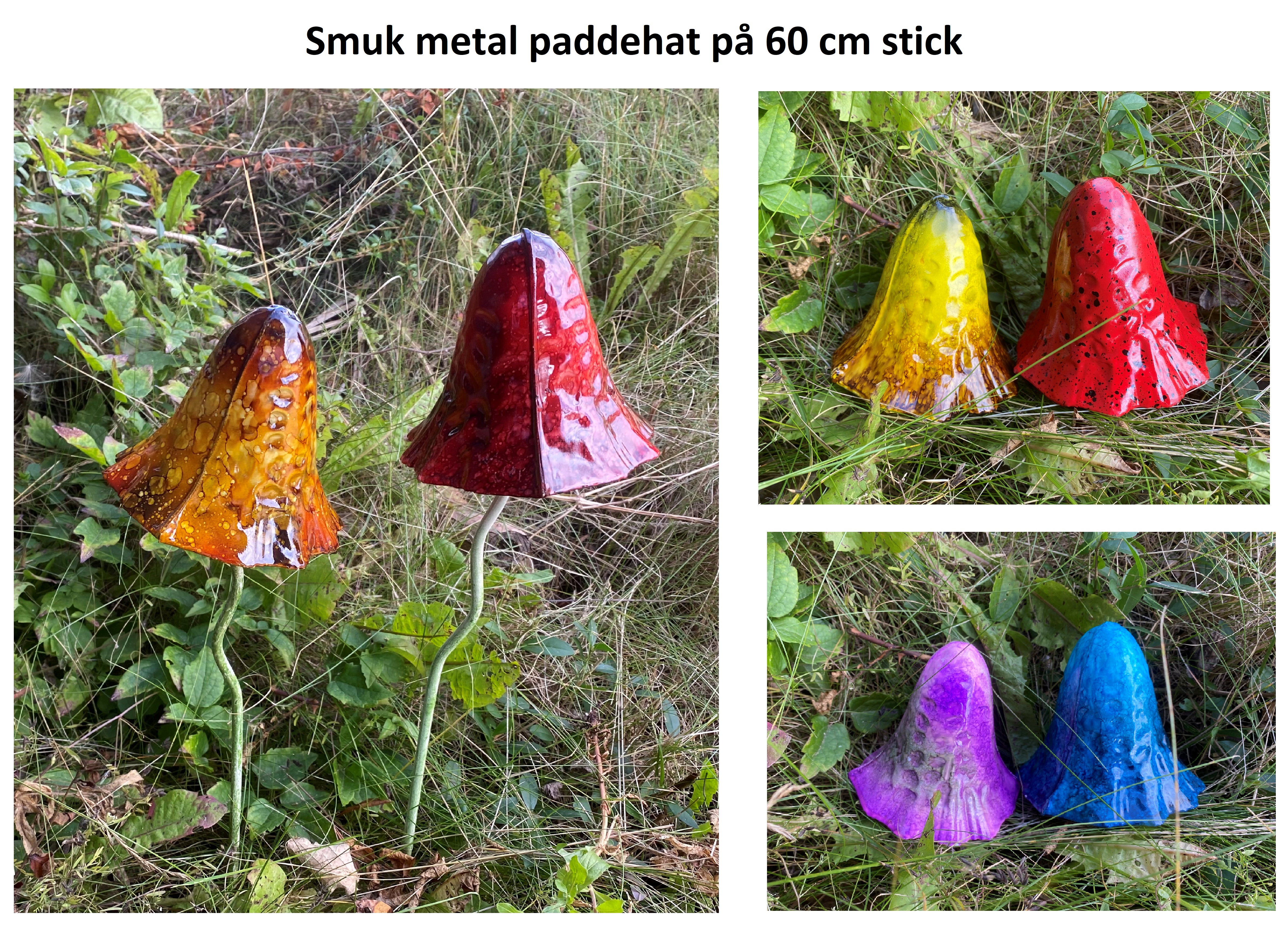 De smukkeste paddehatte i metal, 6 mixede farver pr karton, Sticken er 60 cm, og sættes dybt i jorden for at få et stabilt fæste. Paddehatte hovedet er 11 cm høj og 11 cm i diameter. Den er vejrbestandig, men vil efterhånden patinere når den står udenfor