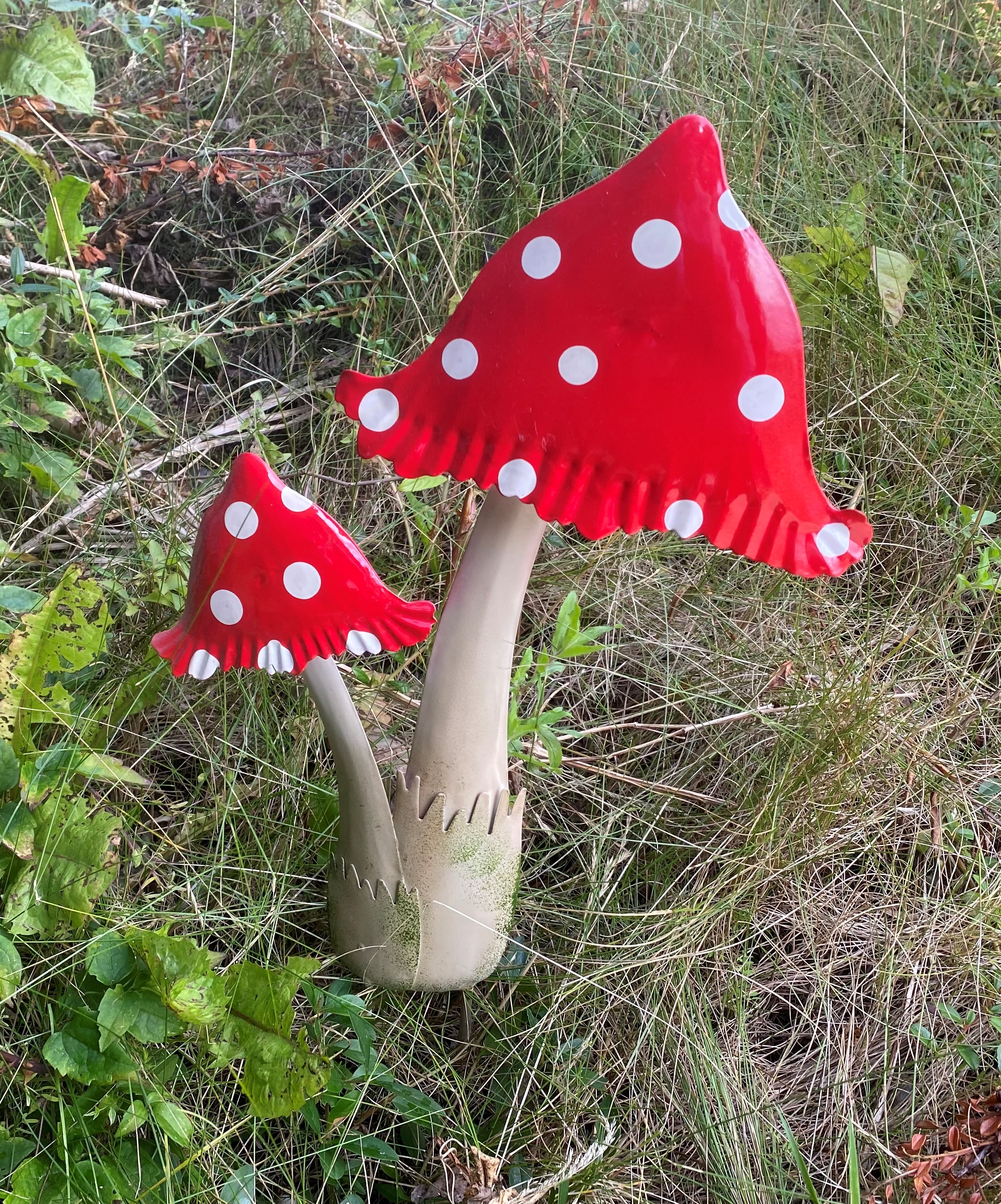 Spændende flot nyhed i metal paddehatte. 52 cm høje, leveres rød med hvide spots. kan være både udenfor og indenfor. Ved brug udenfor vil de patinere hen over tid