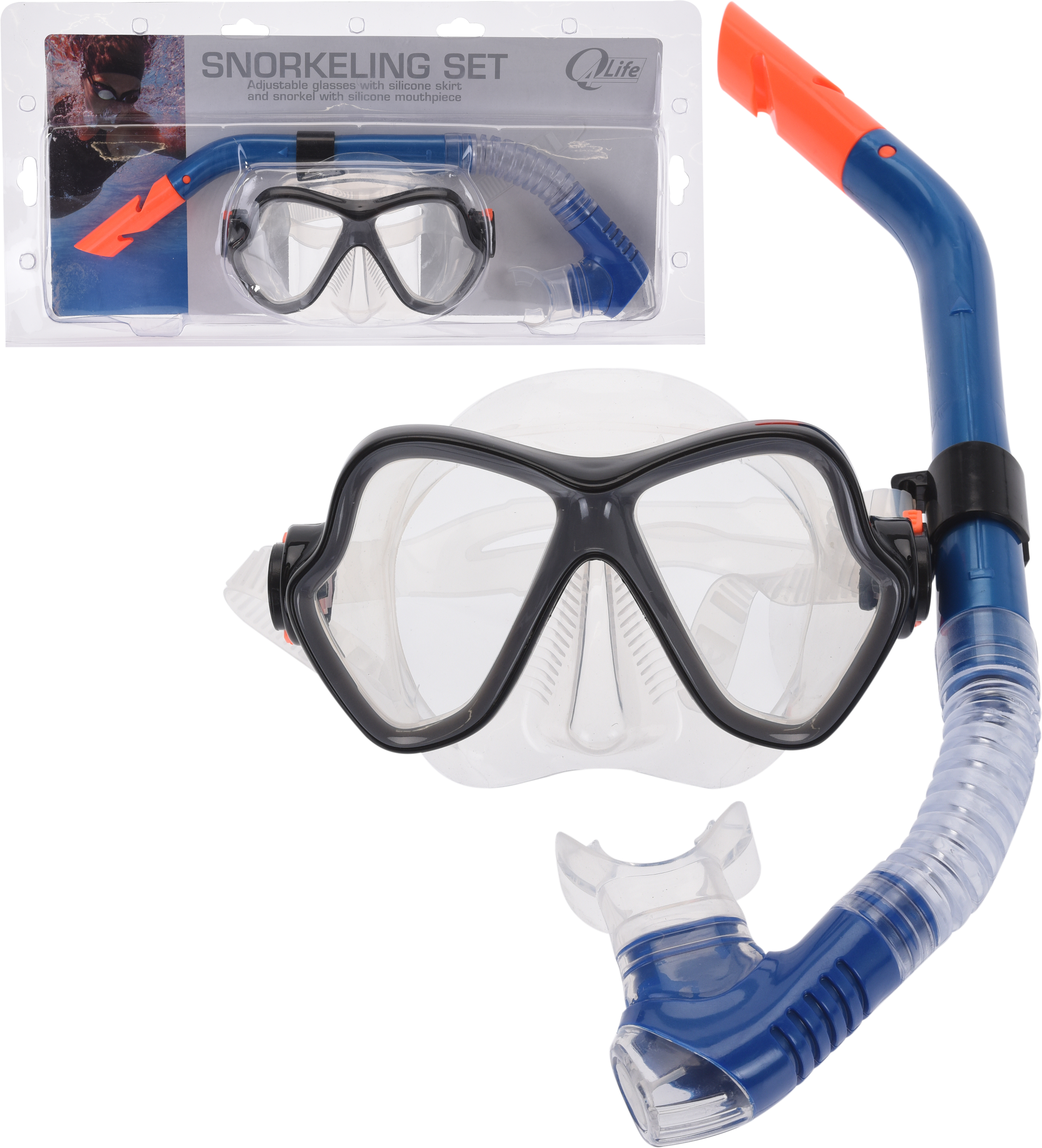 Snorkelsæt med silikone krans, og snorkel med silikone mundstykke.